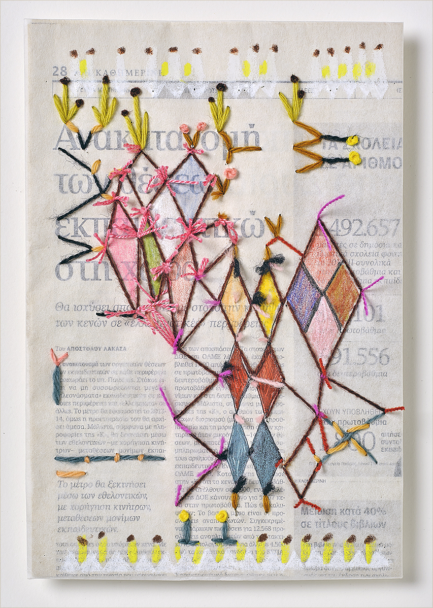 newspapers, Japanese acid free paper, color pencil, metal, beads, woolen thread . 32 x 25 cm