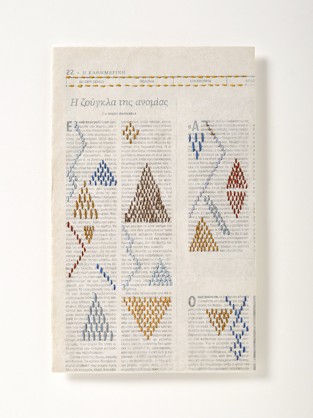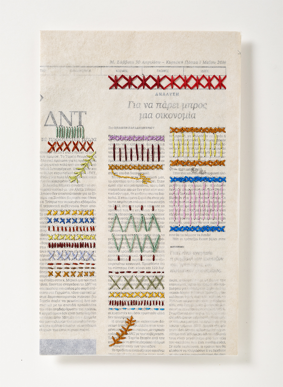 newspapers, Japanese acid free paper, cutout print, embroidery thread . 36 x 25 cm