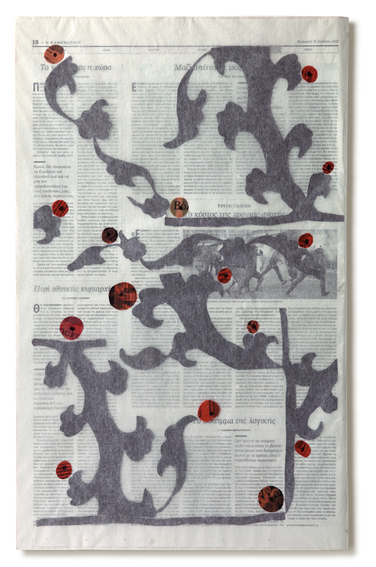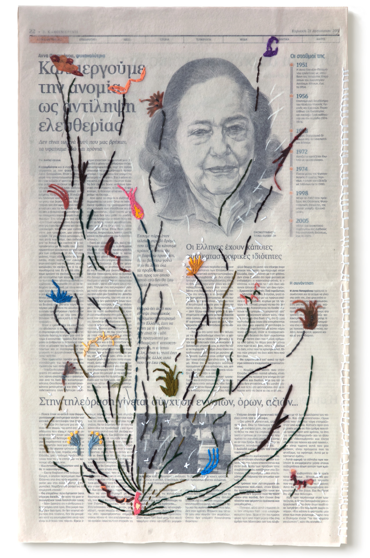 Editions of the Greek newspaper I Kathimerini (2009 - present) have been embroidered with patterns inspired by traditional Greek textile in an attempt to bring some antidot to the overwhelming problematic daily news with fragments of civilization.