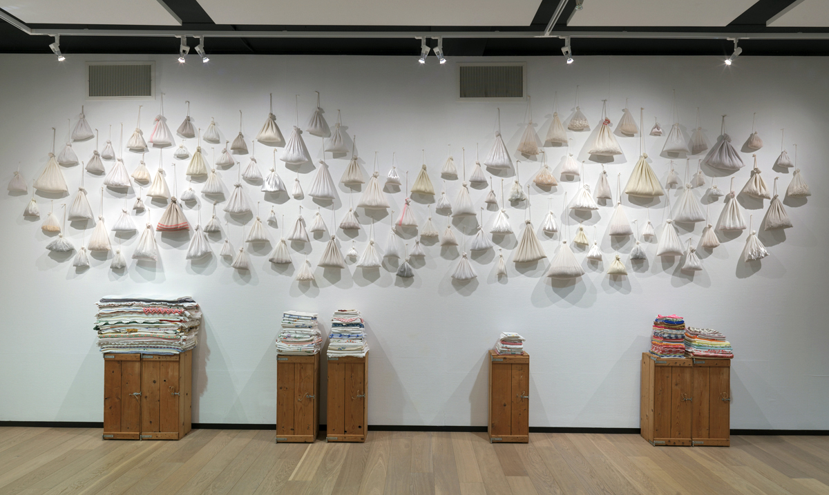 A new version of the installation Alteration with cloth bags filled with dry food and tablecloths from my family heritage. The piece is inspired by life in my grandmother's village in Peloponnese where I spent my summers as a child. Handmade pouches from discarded textiles were the traditional way of preserving food in rural Greece before the advent of plastic bags in the 1970s.