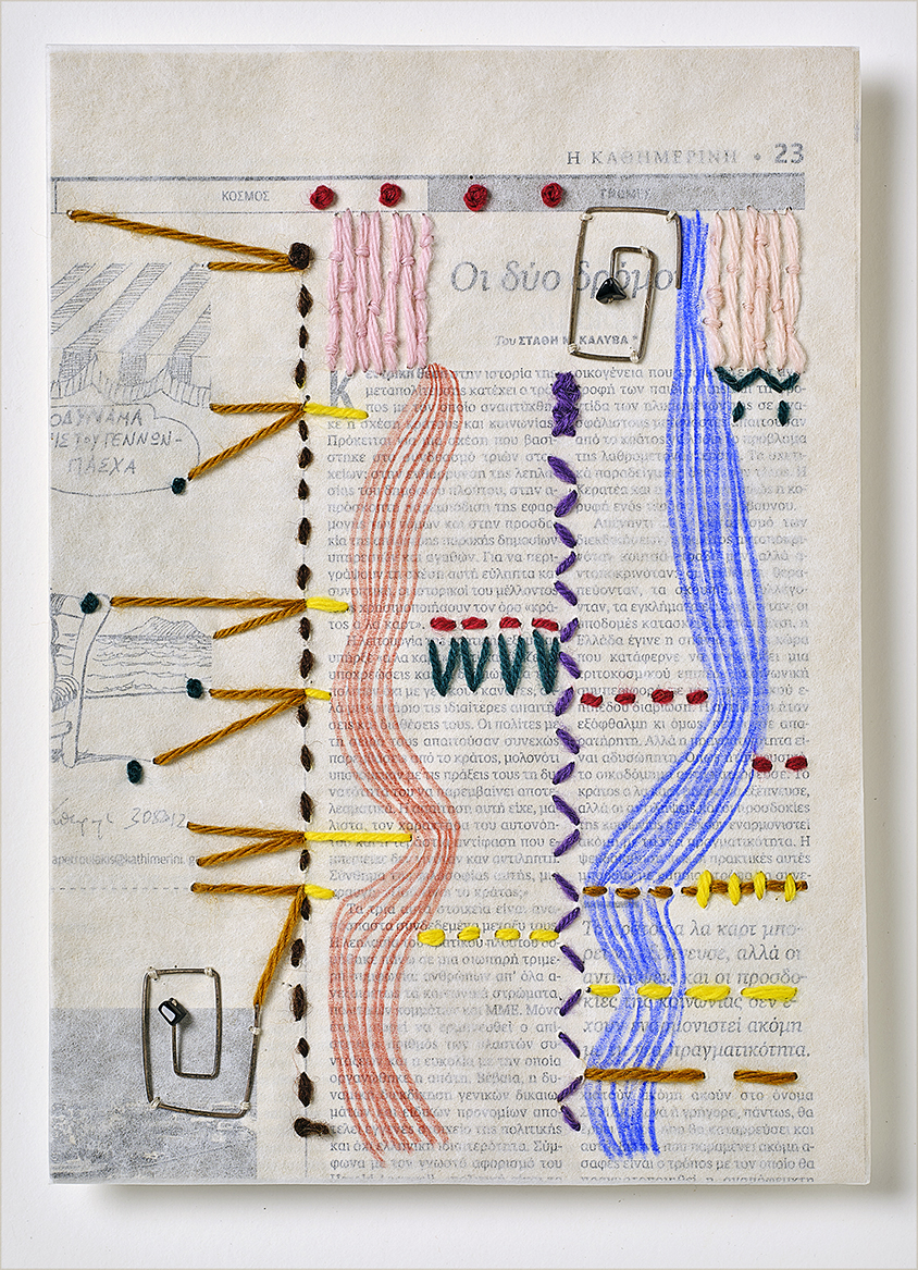 newspapers, Japanese acid free paper, color pencil, metal, beads, woolen thread . 32 x 25 cm . private collection (GR)