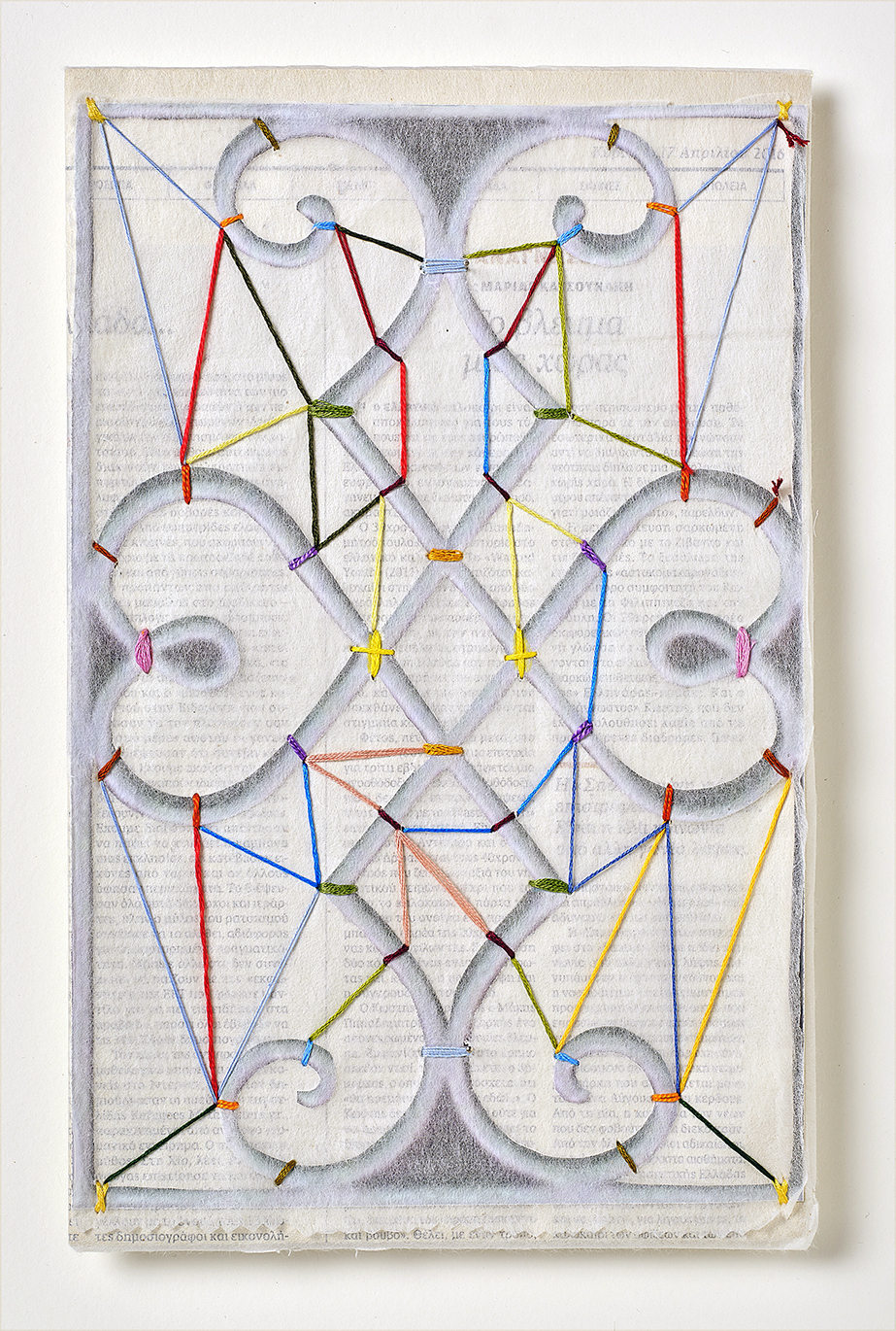 newspapers, Japanese acid free paper, pastel chalk, cotton thread, woolen thread . 32 x 25 cm .
