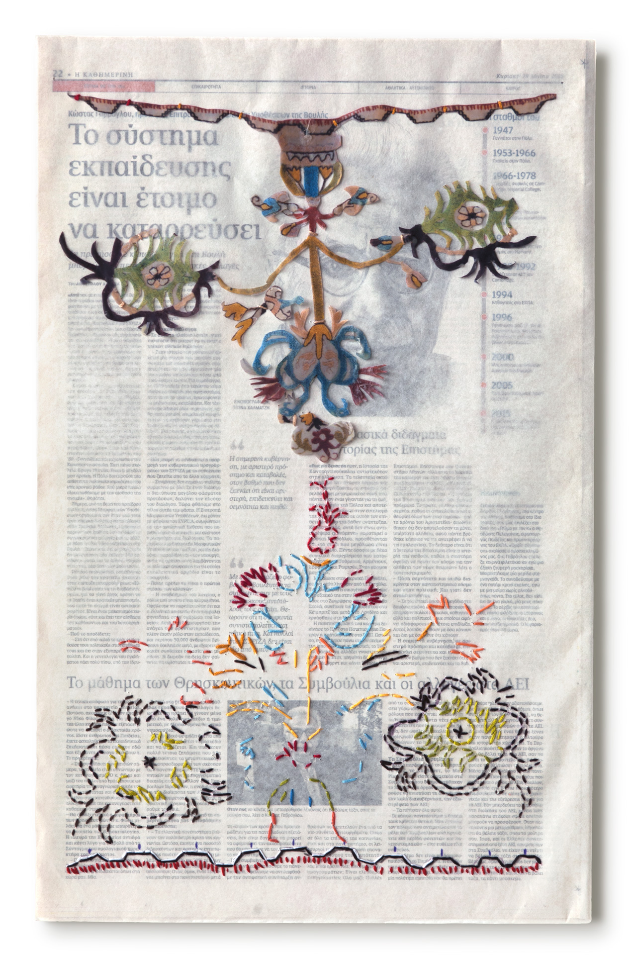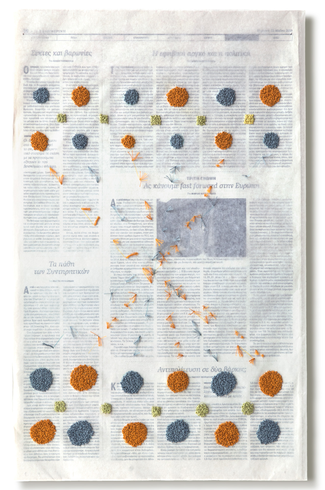 Editions of the Greek newspaper I Kathimerini (2009 - present) have been embroidered with patterns inspired by traditional Greek textile in an attempt to bring some antidot to the overwhelming problematic daily news with fragments of civilization.